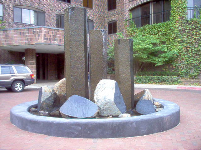 Poured-concrete pool with boulders and basalt pillar fountains. Fountain includes stainless steel submersible pumps, filtration, drains, and auto-fill system.